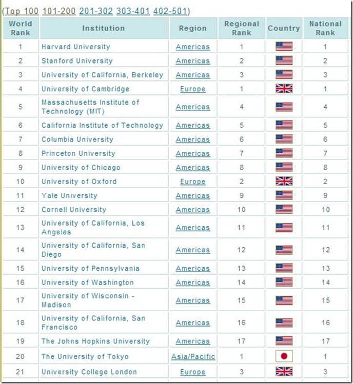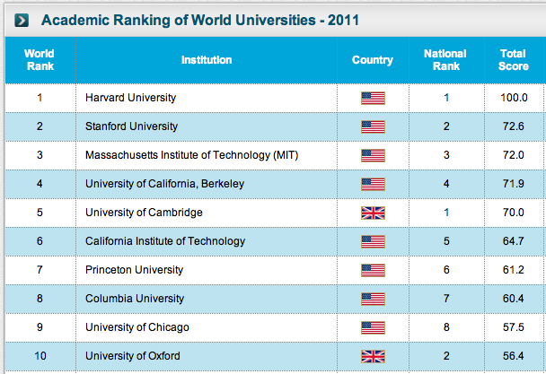 El ranking está dominado por Estados Unidos, que lo lidera con cuatro Universidades: Harvard, Stanford, Massachusetts Institute of Technology y Berkeley. La primera universidad inglesa que aparece es Cambridge, en quinto lugar. Como prueba inequívoca del dominio estadounidense, en la lista vuelve a aparecer otro grupo de Universidades norteamericanas: California Institute of Technology, Princeton, Columbia y Chicago. Oxford queda en décima posición e inmediatamente después aparecen de nuevo las norteamericanas: Yale, California, Los Ángeles o San Francisco.