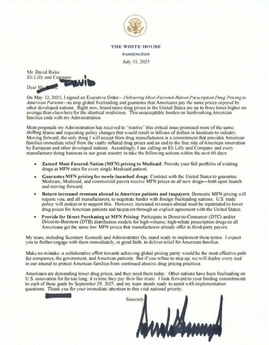 Trump ha enviado una carta a 17 grandes farmacéuticas, entre ellas, Pfizer, Moderna, Eli Lilly, y AstraZeneca, con el objetivo de concederles 60 días para reducir sus precios o los obligará a hacerlo mediante aranceles y otras medidas. Esto verdaderamente puede impactar positivamente en la sociedad, ya que los estadounidenses pagan un 800% más por algunos medicamentos recetados que los europeos. Los precios deberán subir en el extranjero y dejaremos de subsidiar los precios reducidos en los sistemas socialistas que se aprovechan de la investigación y desarrollo de EE. UU. Actualmente, los estadounidenses pagan casi todo este coste. Por eso los precios son más elevados aquí. Los esquemas de medicina socialistas, como en España, no pagan por ello. A partir de ahora, si no financian sus medicamentos, no los tendrán. Lo que pretende Trump es obligar a las empresas farmacéuticas a subir los precios en esos otros países al hacer que cobren el mismo precio en Estados Unidos. Esos países, como España y otros, pueden pagar su parte justa o quedarse sin los medicamentos estadounidenses.