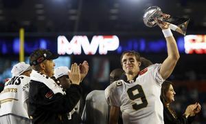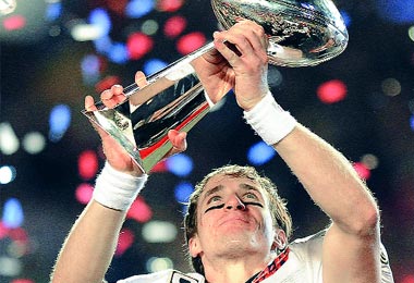 La gloria, en cambio, fue paladeada por los Saints y por su quarterback, Drew Brees, que fue designado el Jugador Más Valioso. Después de un inestable primer cuarto, Brees encontró su ritmo a mitad del segundo período y terminó igualando el récord de pases completos en el Super Bowl con una marca de 32 pases completos de 39 intentos, para ganar 288 yardas y dos touchdowns. Especialmente acertado estuvo durante lo que resultó ser la ofensiva para la anotación definitiva, en la que concretó 10 pases completos seguidos. Su intervención total incluyó 32 pases completos y dos anotaciones; es sin duda un digno y merecido MVP.