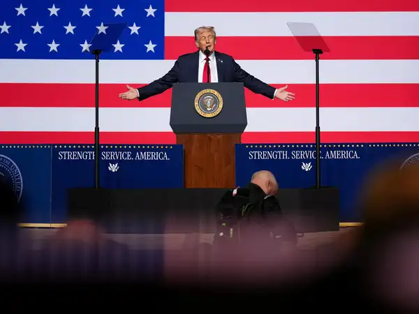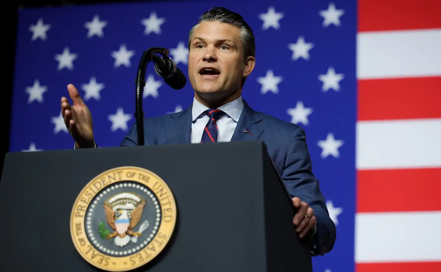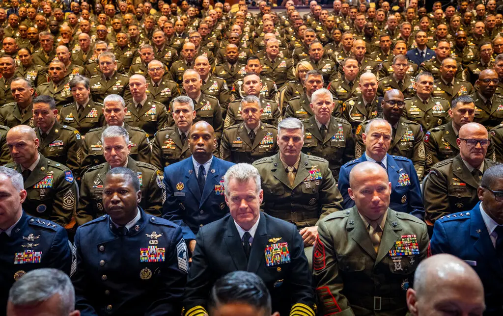 - QUANTICO, VIRGINIA – SEPTEMBER 30: U.S. Secretary of War Pete Hegseth speaks to senior military leaders at Marine Corps Base Quantico on September 30, 2025 in Quantico, Virginia. In an unprecedented gathering, almost 800 generals, admirals and their senior enlisted leaders have been ordered into one location from around the world on short notice. (Photo by Andrew Harnik/Getty Images)