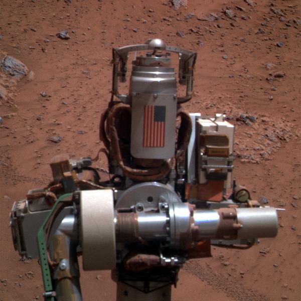 La bandera de Estados Unidos está fijada en el protector de cable de aluminio de la herramienta de abrasión de rocas del Rover, que se utiliza para moler superficies rocosas erosionadas y exponer el material interior para su examen. Está concebida como un monumento a las víctimas de los ataques terroristas del 11 de septiembre de 2001.