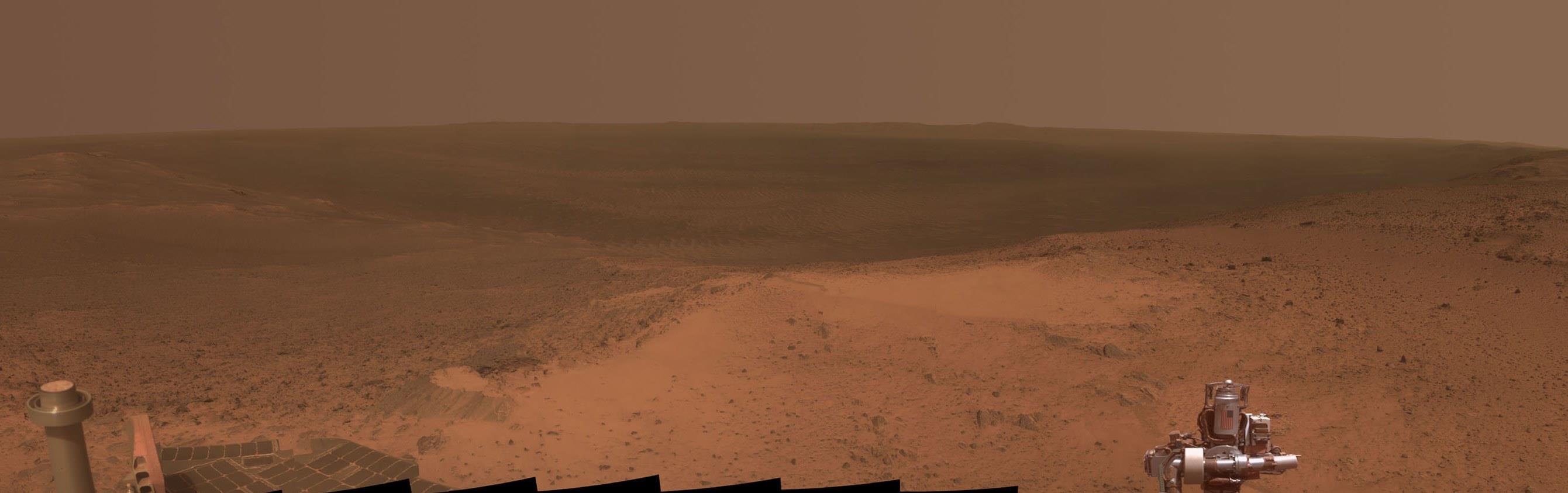 Una panorámica de una de las elevaciones más altas que el Rover Opportunity de la NASA ha alcanzado en sus 11 años en Marte, incluye la visión de la bandera de Estados Unidos en la cumbre. La vista es desde la cima del Cape Tribulation, una sección elevada del borde del cráter Endeavour. La vista se extiende por el interior del cráter, de 22 kilómetros de ancho, y se extiende hasta el borde de otro cráter en el horizonte.