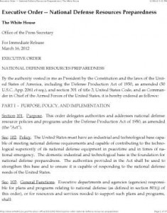 La nueva Orden Ejecutiva “Preparación de Recursos para la Defensa Nacional” es de una trascendencia vital, ya que faculta al presidente de Estados Unidos para asumir el control absoluto de todos los recursos del país en tiempos de guerra o emergencia nacional. Del presidente dependerá escoger el momento y la situación en la que decida aplicar las prerrogativas y los alcances específicos de esta Orden Ejecutiva, que concede plenos poderes a la Casa Blanca para controlar y distribuir por decreto la energía, la producción, el transporte, la alimentación e incluso el agua en caso de que la defensa y la seguridad nacionales estén en peligro o ante una emergencia de cualquier tipo. Un aspecto novedoso de esta Orden Ejecutiva es que no limita su aplicación a tiempos de guerra sino que se extiende también a tiempos de paz si la situación lo hace necesario. Así, quedan comprendidos también bajo esta herramienta legal el control sobre los contratistas y proveedores, los materiales, los trabajadores cualificados y el personal profesional y técnico. Cada uno de los secretarios del poder ejecutivo (Defensa, Energía, Agricultura, Comercio, Trabajo, etcétera) se encargaría de la ejecución de la orden en sus respectivas áreas.