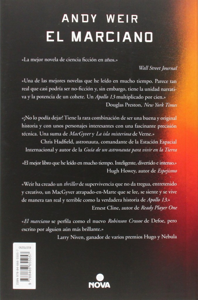 “El marciano” es una novela muy bien construida, ingeniosa, con un suspense inteligente que sorprenderá al lector continuamente y le hará conocer de cerca el cosmos de la naturaleza humana y la lucha por la supervivencia.