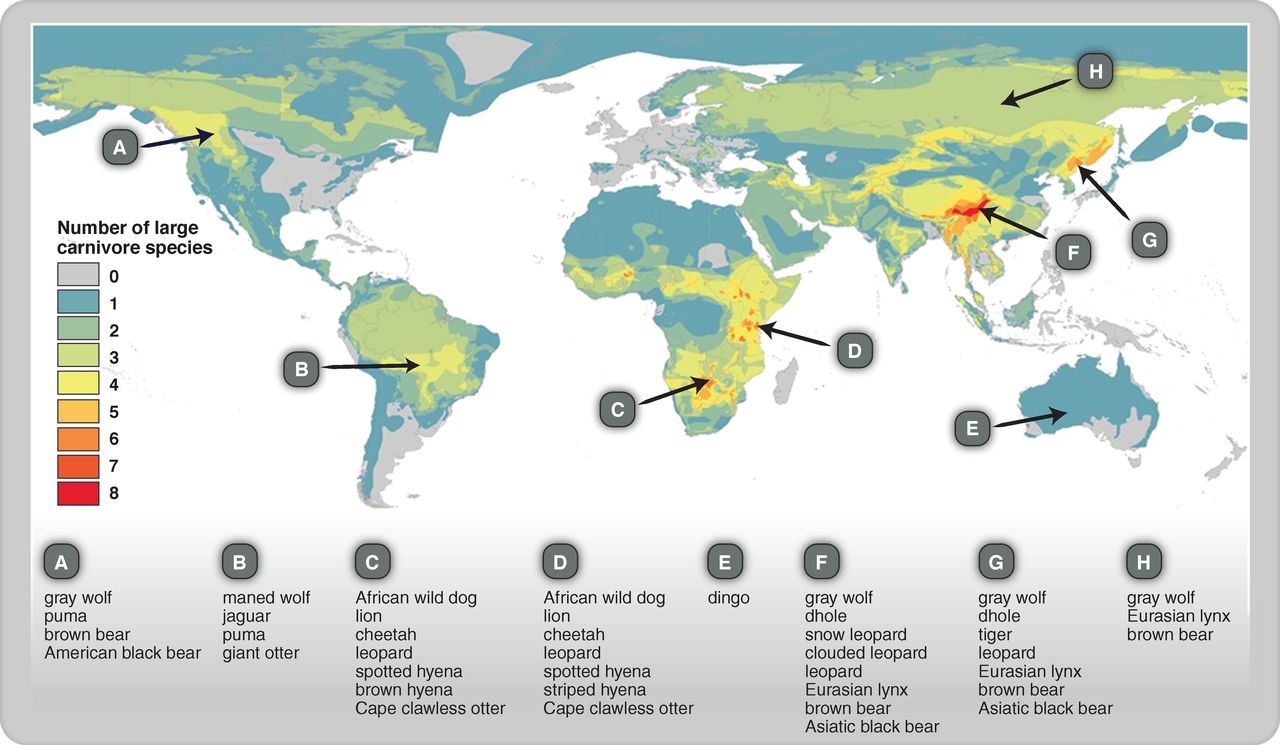 Así, en los ecosistemas de todo el mundo, el declive que afecta a los grandes depredadores, tales como leones, dingos, lobos, nutrias y osos está cambiando el aspecto de los paisajes desde los trópicos hasta el Ártico. De acuerdo a los resultados de este estudio, más del 75 por ciento de esas 31 especies está disminuyendo y 17 de ellas ahora ocupan menos de la mitad de sus antiguos rangos. El sudeste de Asia, el sur y el este de África y el Amazonas son algunas áreas en las que varias especies de grandes depredadores están disminuyendo y, con algunas excepciones, estos animales ya han sido exterminados en gran parte de los países desarrollados de Europa Occidental y el este de Estados Unidos.