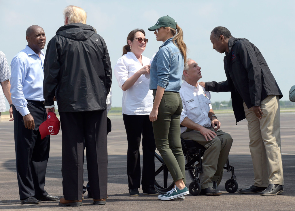 - President Donald Trump and Melania Trump pass out food and meet people impacted by Hurricane Harvey during a visit to the NRG Center in Houston, Saturday, Sept. 2, 2017. The Trumps will also make a stop in Lake Charles, La., to meet with people at an emergency operations center. (AP Photo/Susan Walsh)
