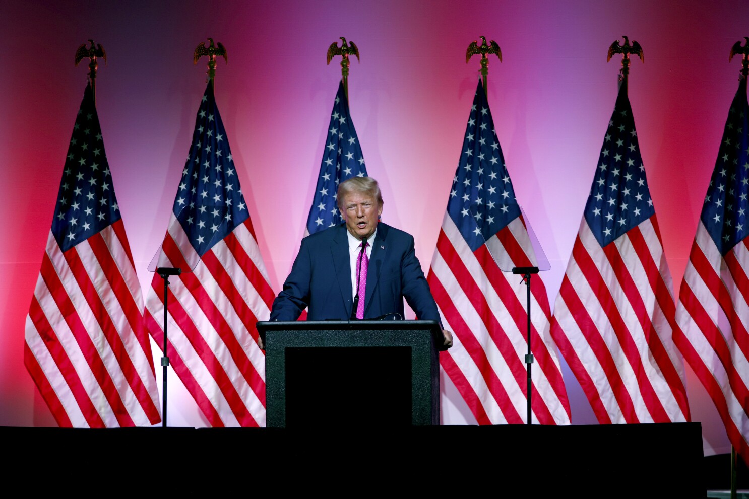 - FILE – Former President Donald Trump speaks during the Oakland County Republican Party’s Lincoln Day Dinner, June 25, 2023, in Novi, Mich. Trump vowed over the weekend to prevent “all communists and all Marxists” from using the U.S. immigration system to enter the country. Is that currently an issue, and how would such an order interact with current immigration law? (AP Photo/Al Goldis)