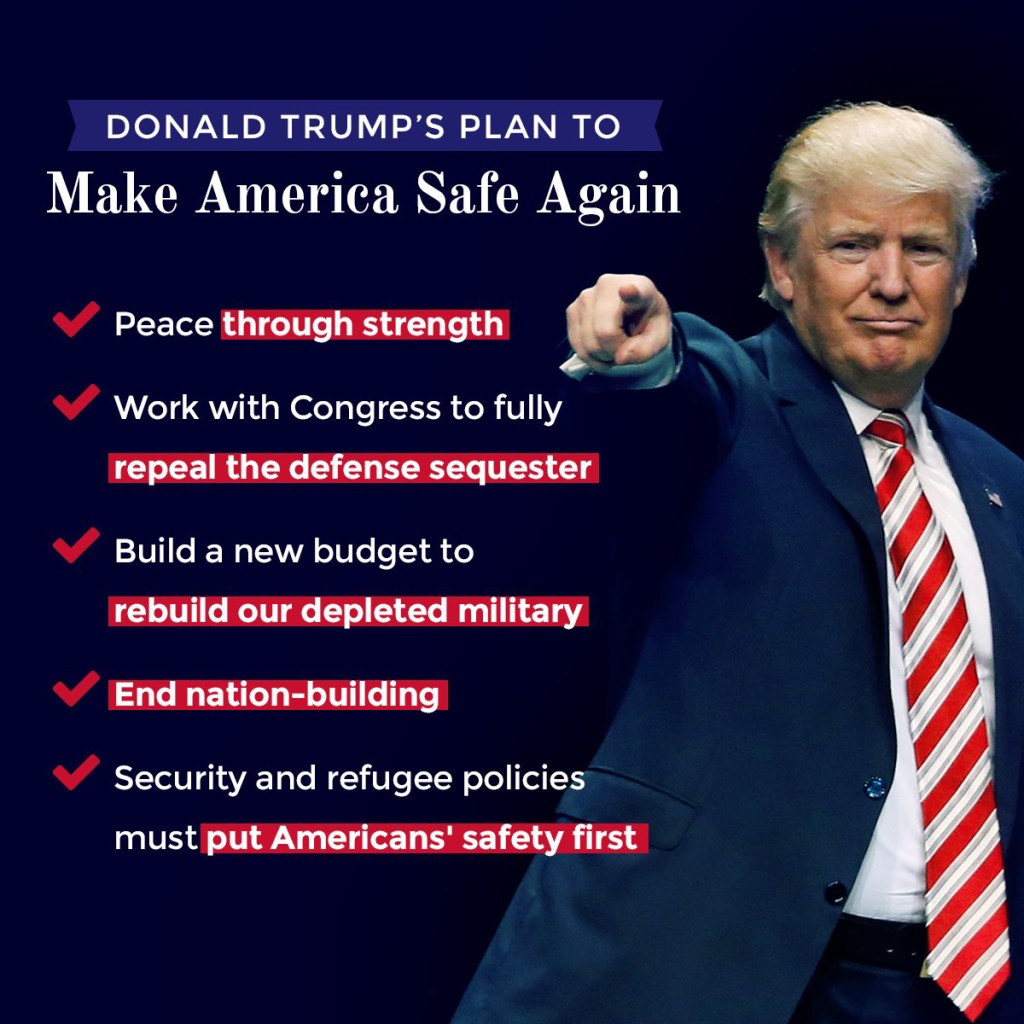 32. Trump defiende reconstruir el ejército, invertir en alta tecnología, aumentar la seguridad nacional y luchar contra la piratería cibernética.